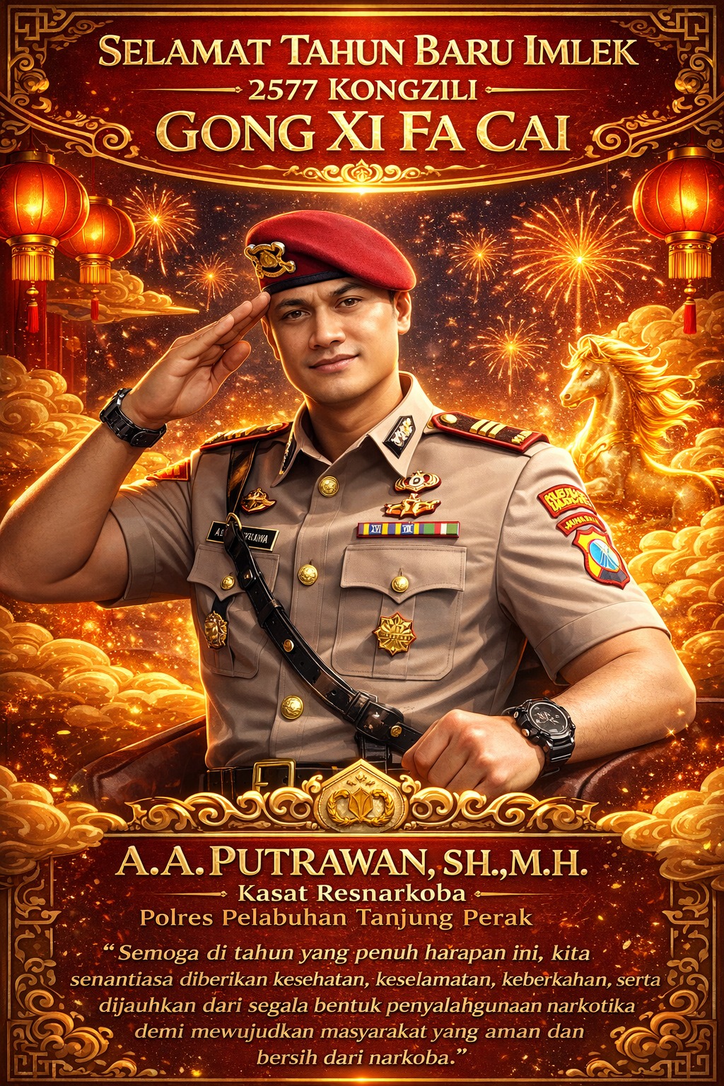 Surabaya,– Dalam momentum perayaan Tahun Baru Imlek 2577 Kongzili, Kasat Resnarkoba Polres Pelabuhan Tanjung Perak, AKP Adik Agus Putrawan, SH, MH, menyampaikan ucapan selamat kepada seluruh masyarakat yang merayakan.