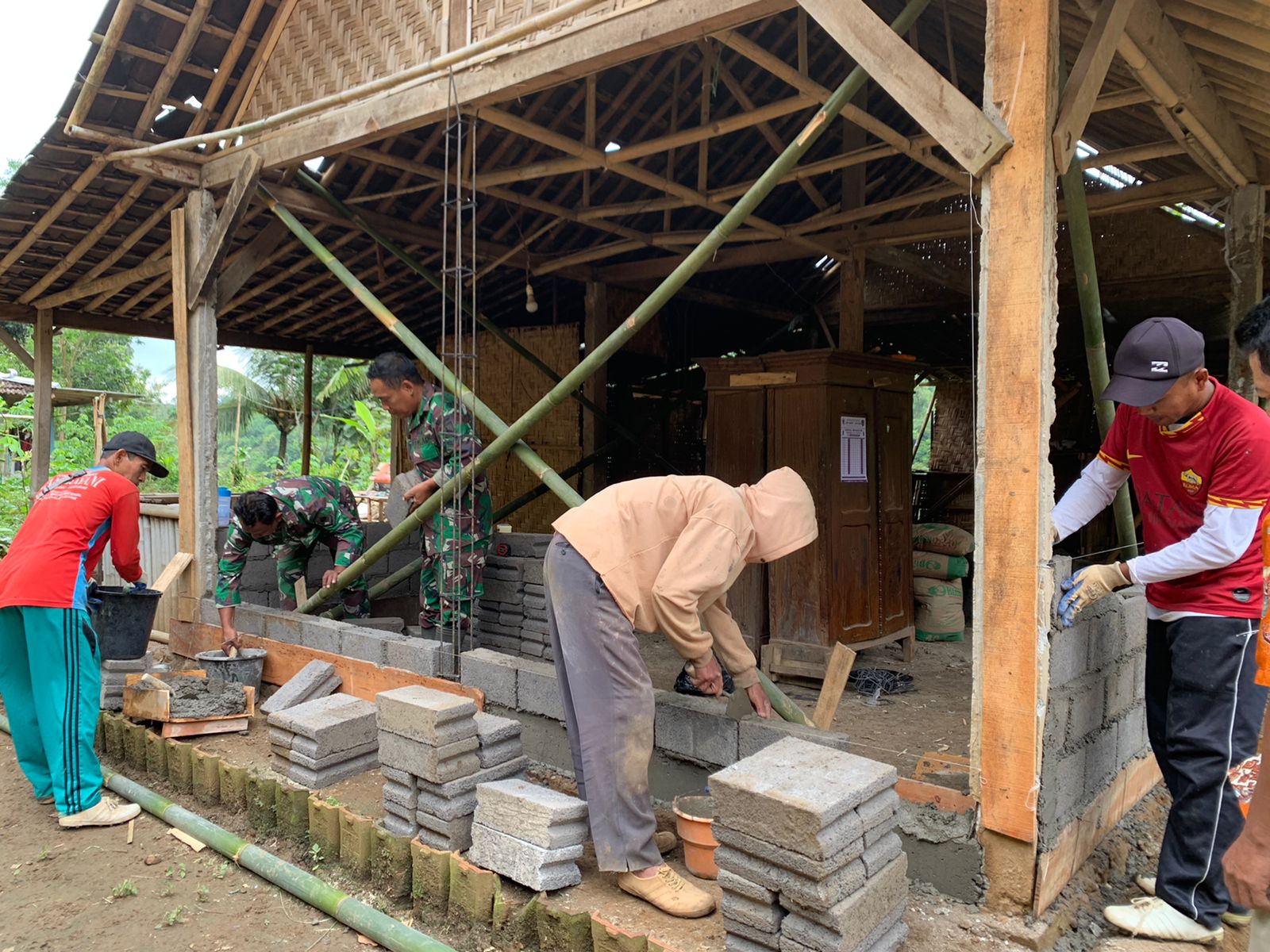 Sejak pagi hari, personel Satgas TMMD bersama warga setempat terlihat bahu membahu mengerjakan proses pembangunan, mulai dari pekerjaan pondasi, pemasangan rangka, hingga penyusunan dinding.